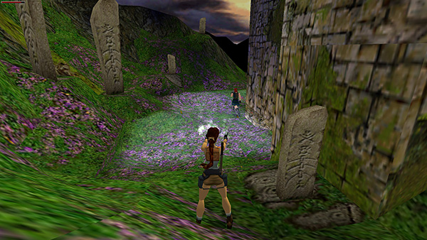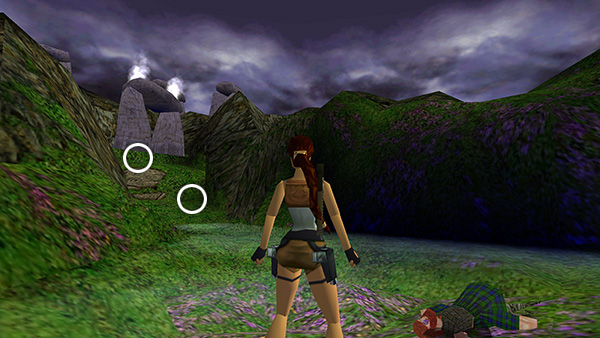 As you enter the misty area ahead, another warrior (16) charges in. (screenshot) A little farther on, you'll meet 2 more warriors (17-18). If you advance slowly, you can deal with them one at a time. Go to the far left end of the misty area and climb onto the green ledges below the megalith. (screenshot) Pick up 2 sets of Uzi clips (40-41), one on the lower ledge and one on the higher. Another pair of Highlanders (19-20) emerge when you take these items.