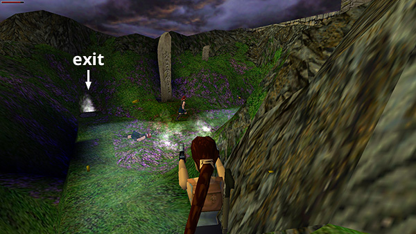 The exit is a small hole on the other side of the meadow from the megalith. It's marked by a steam vent. (screenshot) Drop into this hole onto a walkway between two pools of toxic green stuff. Here you'll meet another Highlander (21). (screenshot) Kill him and climb to the top of the stairs to finish the level.