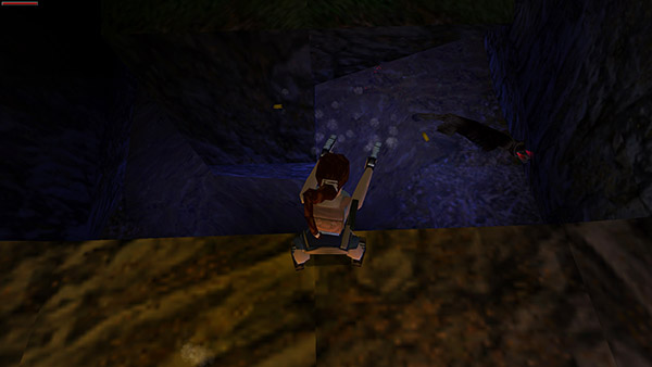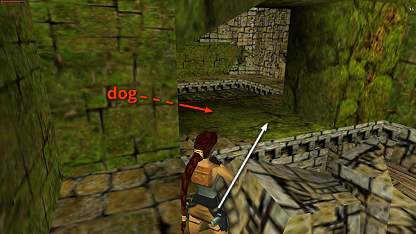 CAVE WITH RADIOACTIVE STREAM: Warning signs indicate hazardous material ahead, so proceed with caution. As you go up the long ramp, the door to the LIBRARY closes behind you. At the top, draw the shotgun, and then climb the low steps to the top of the dais. A mutant dog (10) rushes out of a side passage ahead on the right. (screenshot) Kill it, taking care not to advance too far, since the green, sparkly nasty stuff—presumably toxic material from Willard's experiments—will kill Lara if she steps in it.