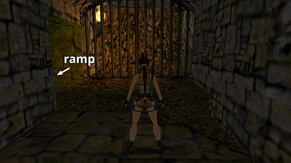TIERED ROOMS WITH SPIKED WALLS: After exiting the boulder room, turn left and go to the top of the stairs. Here you can see a large medi pack on the other side of a set of bars. There's also a green ramp leading down into the next room, which happens to be a deathtrap. (screenshot)