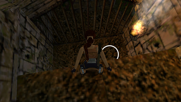 The third pit also has a descending spiked ceiling, and there's a box of shotgun shells (16) below. To get them, stand at the edge of the pit directly facing the ammo, as shown here. Hold Walk and take two steps back from the edge. Now hold Action as you take a standing jump forward into the pit. Lara should land directly on top of the shotgun shells. Continue to hold Action and Lara will pick them up. Keep holding Action as you run forward into the wall, and Lara will pull up onto the ledge with the barred window. Again, roll to avoid the descending spikes. (screenshots)