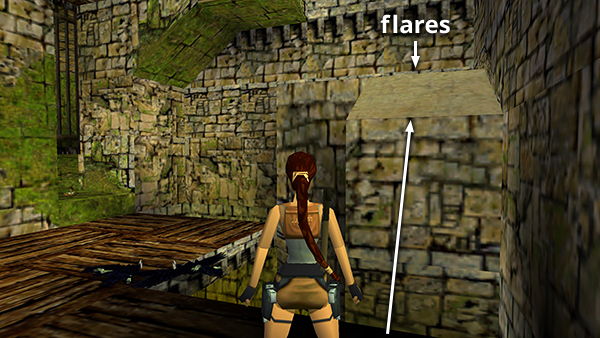 Turn right and walk through the spikes to the far end of the narrow hallway. (screenshot) As long as she walks, Lara will take no damage. Pick up the flares (14) and return to the other end of the hallway.