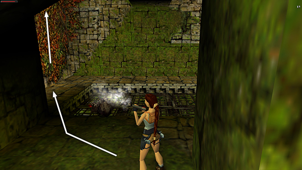 For now, climb onto the ledge above where the flares were (screenshot) and work your way around the edge of the room toward the wide opening with the grating floor. (screenshot) Before jumping over there, draw the shotgun. Then take a standing jump to the right side of the opening where the ceiling is a little higher. (screenshot) Shoot the mutated dog (6) that charges at you from the left, but do not move any farther into the room. If you step on the grating, falling rubble will crush Lara. Carefully walk around the left edge of the room, avoiding the grating. The climb the vine-covered wall to the ledge above on the left. (screenshot)