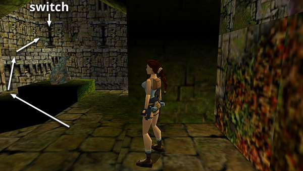 Cross the broken stone floor and jump over to the ledge to the left of the dog statue. Jump from there to the stone steps on the left side of the tall room. Go to the top of the steps and throw the switch to move a set of spikes elsewhere. (screenshot) Return to the bottom of the steps, jump back over to the dog statue and from there to the ledge behind and to the left of it (i.e., the ledge at the top of the vine-covered wall). Climb into the opening above this ledge. (screenshot)