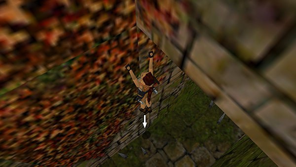 Alternatively, turn right and run forward down the slope away from the boulder. At the end of the slope, roll and grab the edge to avoid falling into the spikes below; or as soon as Lara lands, turn left to face the boulder and hop back three times, holding Action on the third jump to grab the edge of the slope and avoid falling into the spikes below. After the boulder rolls by overhead, pull up and pick up the CROWBAR (2) lying on the slope. (screenshots)