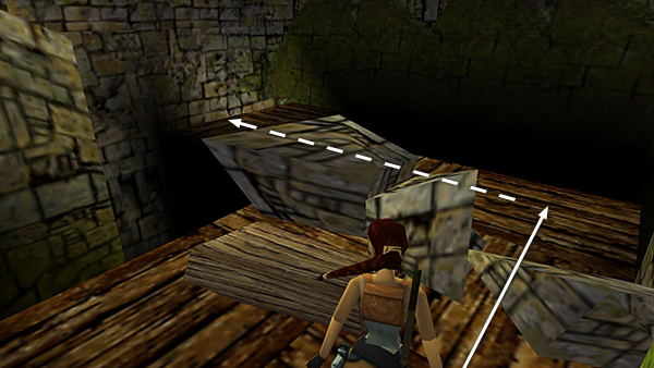 BOULDER TRAP ROOM: This next physics-defying room contains a number of boulders that roll when you pass in front of them, sometimes rolling through each other, yet flattening Lara if she's in the way. The diagram at right shows the boulders in their starting positions and one possible path to avoid them and get all the goodies. This sequence is also shown in a short video walkthrough.
