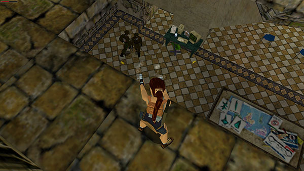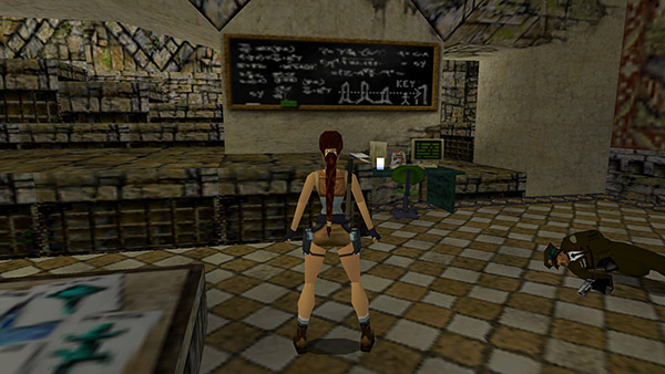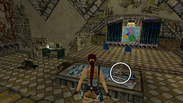 Pick up flares and a small medi pack (26-27) dropped by two of the guards. Take the CAIRN KEY (28) from the low, rectangular table with the maps and sketches on it. (screenshot) Notice the diagrams on the blackboards showing the steles of varying heights and the word "KEY". (screenshot) There are also copies of Tomb Raider 2 Gold sitting at the various workstations. But no time for gaming now. Let's move on....