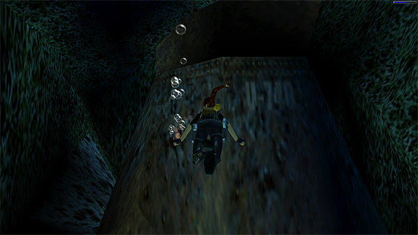 THIRD POOL - FAR SIDE OF THE CAVERN AND SECRET #2: After using the CIRCUIT BULBS to open the yellow door, jump back in the pool and swim down to the bottom, then up past the right side of the crane, following the globe lights on the sea floor. Near the third light globe, there's a bunch of harpoons (31) lying on the bottom. Grab it and then swim to the right, past the third globe. The current sucks Lara to the top of the large cave opening, and you see another submersible descending to deliver 2 more scuba divers (8-9). At this point, you can try to harpoon the divers or turn around and head for the small opening in the ceiling of the cave, where you found the second CIRCUIT BULB. Then climb out of the water and shoot the divers through the opening. (screenshots)