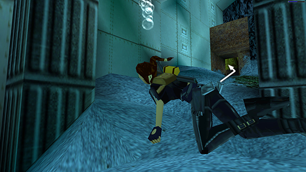 Swim to the middle of the pool and surface for air in the crate room. If you didn't press the button on the wall here earlier, do that now to open the white gate. Now tread water with the button directly ahead and the green crates on Lara's right. Then swim down and forward, and the white gate will be almost directly ahead. Swim through and let the current sweep Lara up the tunnel into the next area. (screenshots)