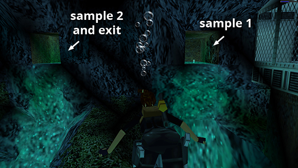 RESEARCH LAB: Surface and climb out of the water. Ignore the gunman (14) in the room off to the side for now. Follow the ramp down to a SPECIMEN ROOM with tanks and cages containing various mutants. Move the 2 green crates. Underneath one you'll find Uzi clips (52). Behind the other is a chemical analyzer. Place one of the MUTANT SAMPLES into this machine. Place the other sample into the second analyzer in the corner to the right of the ramp. This causes water to flow into a pool elsewhere. (screenshots)