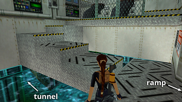 Stand at the edge of the pool with the green boxes behind Lara and jump into the water. The white gate you just opened will be on Lara's right. If you want secret #1, do not go through this gate yet. Once you do, it's impossible to backtrack, so you'll miss the secret. Instead swim straight ahead toward the cage where you entered this area. If necessary get air inside the cage. Then swim up between the cage and the yellow structure. Grab some Uzi clips (13) sitting on the yellow ledge just above the cage door. Turn right and swim along the side of the yellow structure into the square opening at the end of the ledge. Follow the twisty tunnel and pick up 2 bunches of harpoons (14-15) on the way. (screenshots)