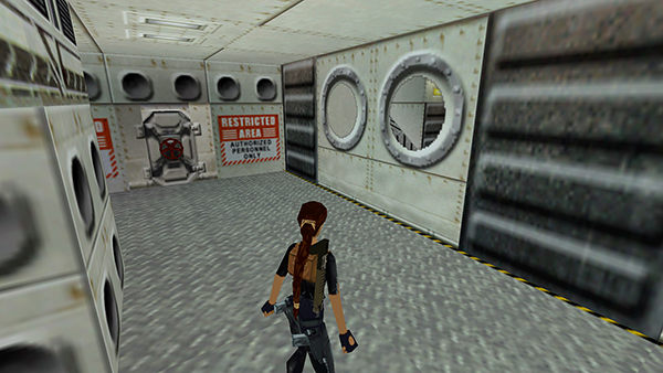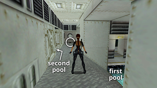Swim back the way you came—through the connecting tunnel to the little room with the lever, down through the opening in the floor, back to the middle of the big pool, and up through the opening in the yellow structure into the square pool where you shot that first sniper. Climb out of the water and exit into the hallway. Go around to the right until you come to the "Restricted Area" door you opened earlier. Pick up a small medi pack (8) on the ledge just inside on the left. Then follow the hallway all the way to the end to find some MP5 clips (9) sitting on the floor. (The first pool is now below on the right. If you slide in by accident, just climb out of the water and follow the hallway back to the "Restricted Area" door.) (screenshot)