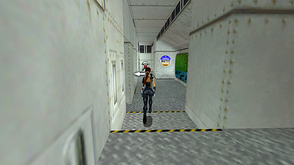 When you come out the other end of the tunnel, 2 friendly dolphins greet Lara. The camera will show a wide-angle view of this area as the current carries Lara to the left, toward the rectangular alcove between the building on the left and the pipeline on the right. Swim into the square opening on the left. Follow the tunnel down to a T intersection and turn left. Come to the surface for air but don't climb out of the water yet. If you linger near here, one of the dolphins should come and give Lara a boost onto the ledge. (How cool is that?!) This is secret #1, harpoons and 2 large medi packs (16-18). (screenshots)