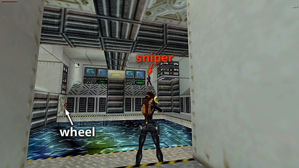 Go through the door on the left. Kill the sniper (1) in the raised hallway across the pool. If you don't get him, he runs off to the left. Go around the edge of the pool and turn the red wheel to open the "Restricted Area" door you saw earlier. (screenshot) If the sniper is still alive, he'll come through that door and around toward you. Wait for him and finish him off.