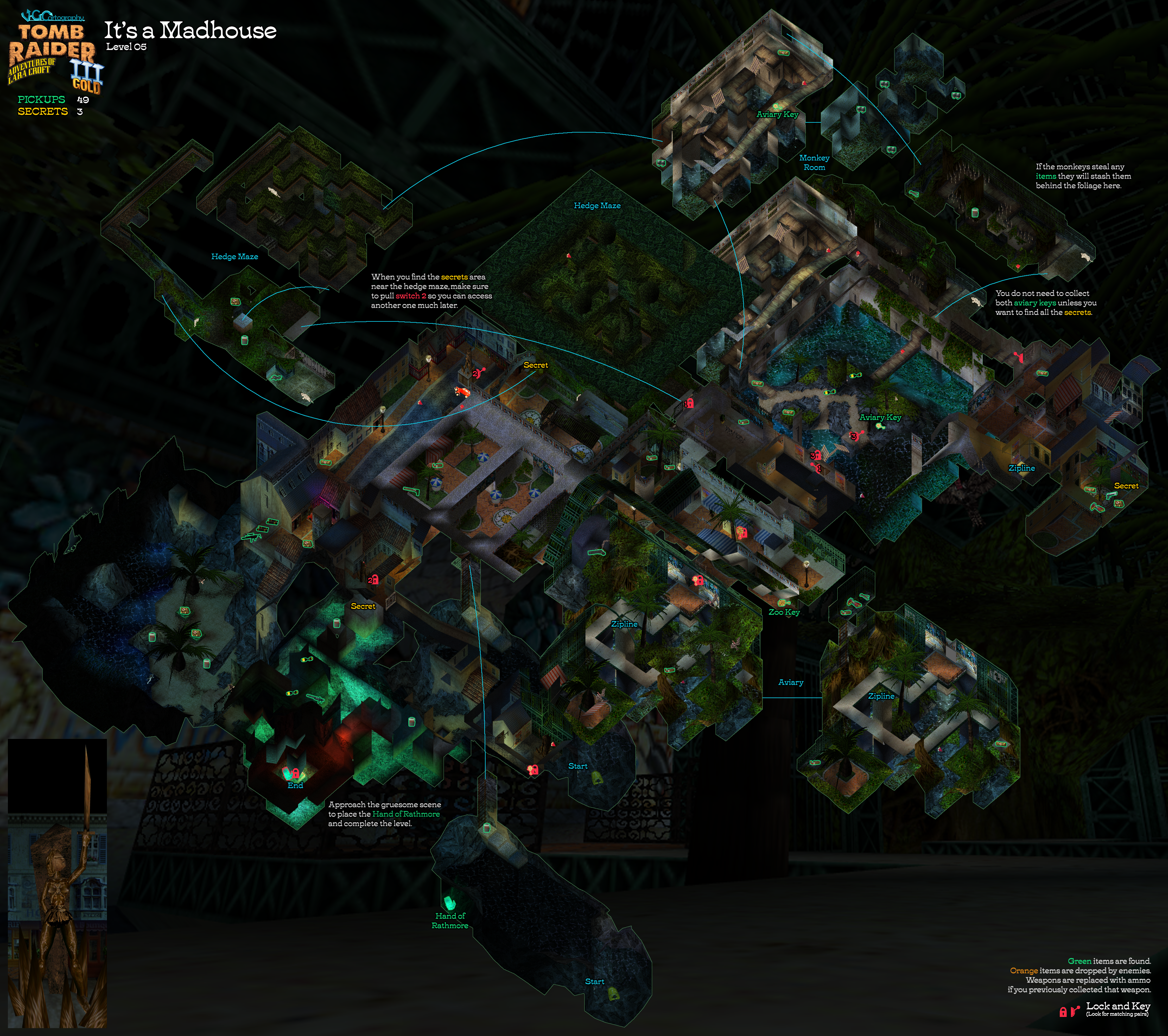 MONKEY PLAY AREA: As you enter this open area with wooden walkways and bridges, a couple of monkeys (7-8) rush to grab the goodies: the FIRST AVIARY KEY (17), which is lying on the walkway on the far right, and a small medi pack (18) near the exit. (screenshot) You'll have to kill the monkeys to get the items. The wrought iron gate in the corner opposite the entrance closes automatically as you approach. Don't worry about this; you'll be leaving through the other doorway.