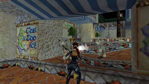 Equip the shotgun (or your weapon of choice) and head up the uneven steps between the two zoo maps (C'Est Le Zoo Ici!) As you do, 2 white tigers (1-2) charge down. (screenshot) If you're low on ammo or just want to play it safe, you can roll, run back into the room at the foot of the stairs, and climb into one of the ledges near the doorway to shoot the tigers from safety with pistols. (screenshot)