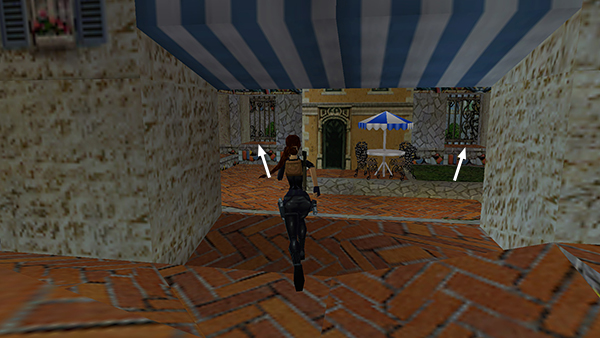 NOTE: If you miss the medi pack, the monkey will carry it up the hill to the small barred ledge with the "Patisserie" signs. You can still get it using the crawling corner bug. See the page with screenshots for additional details.