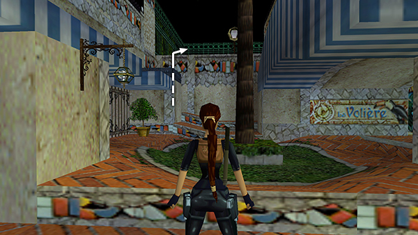 AVIARY: Cross the courtyard to the AVIARY entrance ("La Volière") and use one of the AVIARY KEYS to unlock the gate. Enter and follow the elevated walkway out to the middle of the room. Kill the 2 vultures (14-15) that fly in from above. One of them tends to get stuck near the striped awning on the far side of the room, so you may have to move closer to target it. As you shoot the birds, take care not to fall off the walkway. The pool below is infested with piranhas. (screenshots)