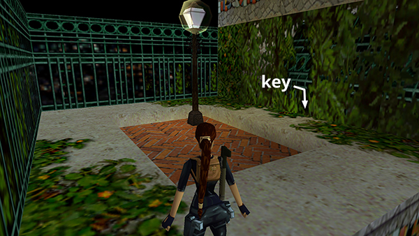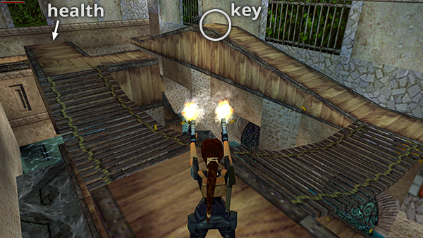 BUG NOTE: I encountered a bug here in which, after shooting the monkeys but before picking up the key, I saved the game. When I reloaded, the key was gone. So, I recommend picking up the key before you save in this area. If you made the same mistake, you can download my save file, in which Lara has the first Aviary Key. For help with savegame and zip files, click here.