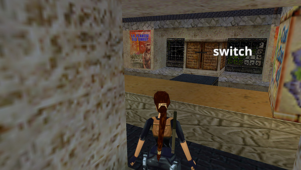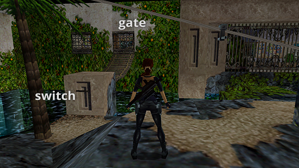 Use the switch on the cement block to open the gate ahead. It is timed, so pull the switch, hop back, take a standing jump onto the block, and then sprint across the bridge and through the gate before it closes. (screenshot) You're now back in the low-ceilinged room with square pillars near the MONKEY HOUSE ENTRANCE.