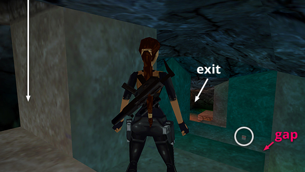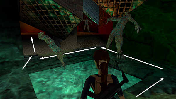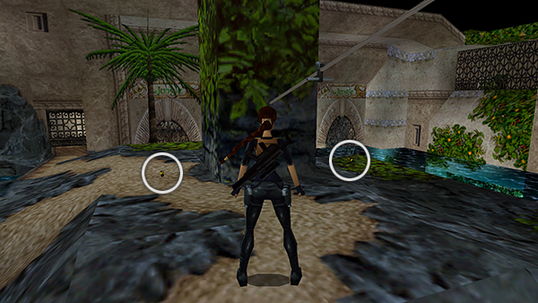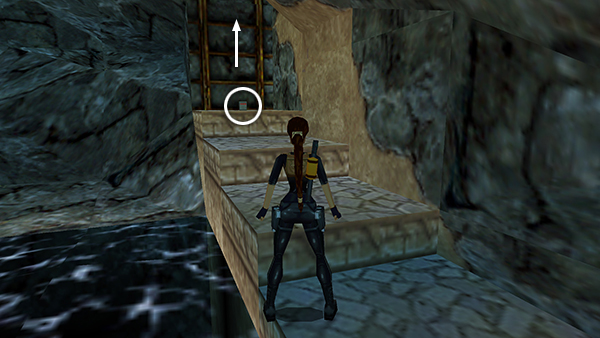 SHORTCUT FROM SECRET #1 TO THE END OF THE LEVEL: If you like, after obtaining secret #1, you can drop down onto the beach with the mutant creatures near the end of the level. This involves hopping back off the corner ledge and holding Action to alter the curve of Lara's fall so she lands on the angled rocks below. This sequence is shown on a separate page with screenshots. Thanks to Emily for sharing this info.