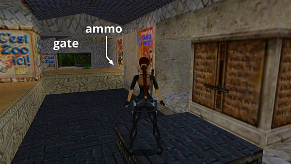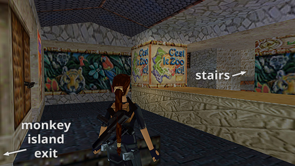 Go to the top of the uneven stairs. Note the locked gates on each side. The posters here, and elsewhere in the level, are wittily chosen from popular movies. "La Volière" (The Birdcage) hangs outside THE AVIARY. "La Planète des Singes" (Planet of the Apes) decorates the MONKEY HOUSE. "Jeanne D'Arc" (Joan of Arc) is reminiscent of the golden statues.