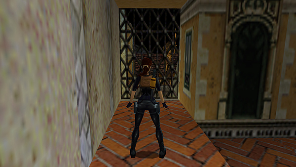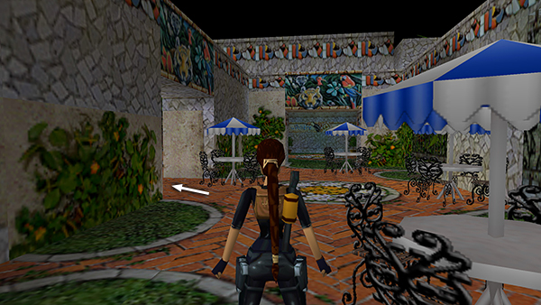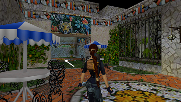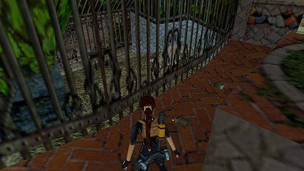 SECRET COURTYARD: Cross the wooden walkway to the right of the zip line handle and go through the gate, which opened when you slid into this area. Instead of re-entering the room with the spiked walkways, immediately turn right. Go up the stairs and through the gate near the switch (the same way you came before). Continue to the end of the brick-floored hallway. Now the gate is open and you can go in and get the goodies. This is SECRET #2: small and large medi packs and 2 sets of Desert Eagle clips (32-35). If you didn't shoot all 3 monkeys on the island, one of them may have stolen the small medi pack from the secret area. Don't worry; we'll find it in a moment. (screenshots)