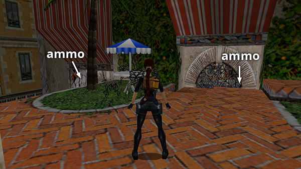 Move to the right side of the elevated walkway (left if Lara is facing the entrance) where there are 3 big, square trees. Notice the wooden ladder behind the middle tree. Jump down to the base of the tree and climb the ladder to a small room with shotgun shells, Desert Eagle ammo, and Uzi ammo (36-38). Grab the goodies and slimb back down. (screenshots)