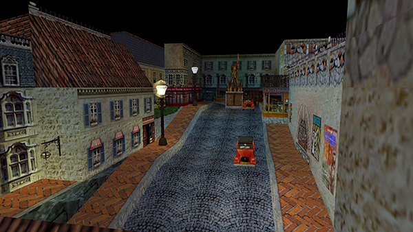 STREET WITH GOLDEN STATUE: Just to the left of the ramp and the thick, dangling vine is an opening concealed by leaves. Walk through the foliage and the chime sounds for SECRET #1. Climb up two ledges, then up to the left onto a third ledge, which juts out above the street. A cut scene shows another red car speeding down the hill. (screenshots)