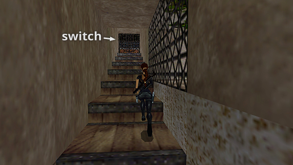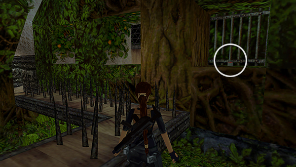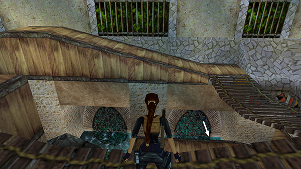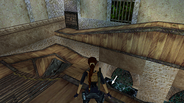 Move carefully along the walkways to the far end of the room and go through the doorway on the right, into a hall with stairs going up on both sides. (screenshot) Climb the stairs on the left and use the switch to open the gate. (screenshot) If the monkey (11) grabs the small medi pack (26) on the low pedestal in the next room before you can get it, either shoot the monkey or follow him downstairs to see where he hides it: Just inside the room with the spikes is a thick, square tree trunk. Behind this tree is a green plant with broad leaves. The medi pack should be in the little alcove behind this plant. (screenshot) Get it and return up the stairs through the gate you just opened with the switch.
