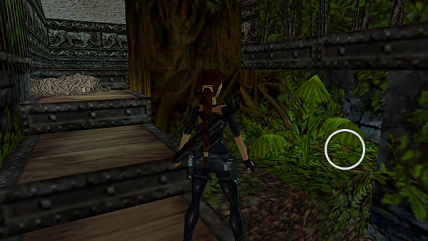 When the tigers are dead, continue forward, still following the path marked with blue dots. Enter the low-ceilinged passageway where the tigers came from, turn left, then left again, and follow the ramp down into the TIGERS' ENCLOSURE. At the bottom of the ramp, go around the thick vine dangling from the ceiling and continue forward through the foliage into the cage proper. Pick up the Uzi clips (11) inside. Then return along the path through the bushes to the bottom of the ramp. (screenshots)