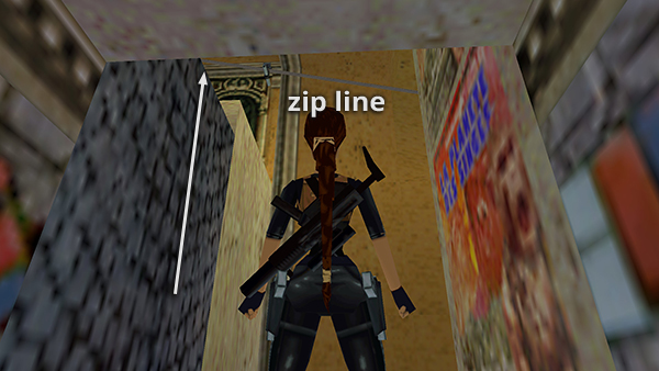 NOTE: If it's been a while, or you haven't played Tomb Raider 3, in order to use the zip line, position Lara at the edge of the ledge just below the handle. Press and hold Action and don't release it until she lands on the island.