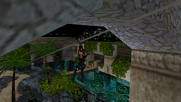Move around to the right and take a standing jump across the water to the nearest corner of the stone island with the palm tree and the square column supporting the first section of the elevated walkway. Take another standing jump up the slope to land just to the right of the palm tree. Carefully walk forward to the edge in order to avoid sliding down the slope into the piranha pool. Jump straight up to grab the edge of the walkway and pull up. (screenshots)