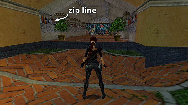 If you killed all the monkeys and picked up all the small medipacks in this area, exit the SECRET COURTYARD and go through the first doorway on the left. (screenshot) Climb up to the zip line and ride it back down to MONKEY ISLAND. (Skip the next paragraph.)