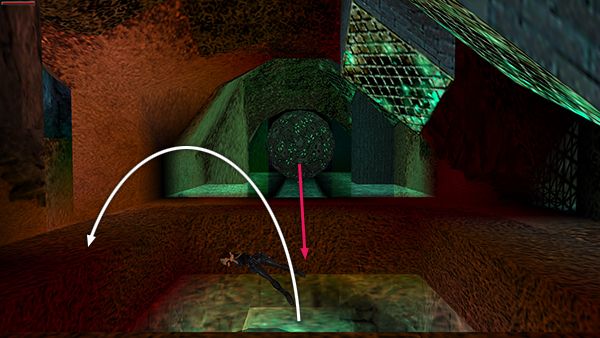 Walk forward around the rim of the pool of deadly mutagen toward the long, rectangular pool with another huge meteorite at the far end. If you look closely, you'll notice a translucent walkway running down the center of the long pool. Light a flare or fire pistols to make it more visible if necessary. Jump onto the corner of this walkway to start the meteor rolling. Then quickly backflip out of the way. (screenshot) Follow the translucent walkway nearly to the end, picking up 3 pairs of grenades (1-3) as you go. Do not roll after picking up the third set of grenades. The walkway does not extend all the way to the far wall, and Lara will fall into the pool. (screenshot)