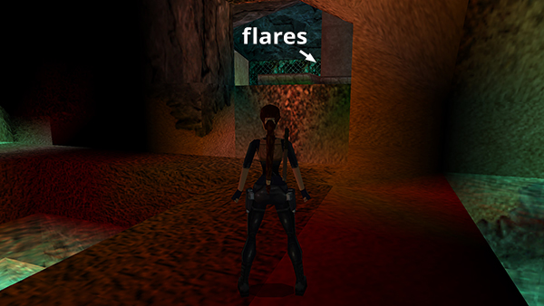 Return to the middle of the long room, where you started, and follow the other translucent walkway nearly to the end, picking up a rocket and more grenades (4-5). Again, mind the gap at the end of the walkway. When you have everything, return to the square pool at the start. Climb up through the opening on the right (i.e., the side without the two barred windows). Go behind the pillar to get some flares (6). (screenshot) Once again, return to the start.