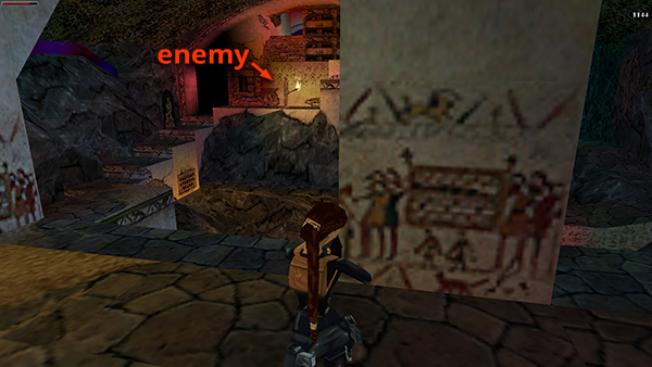 NOTE: If you didn't kill the enemy who appeared when you picked up the large medi pack on the level below, you may be able to get a good shot at him from behind this pillar. (screenshot)