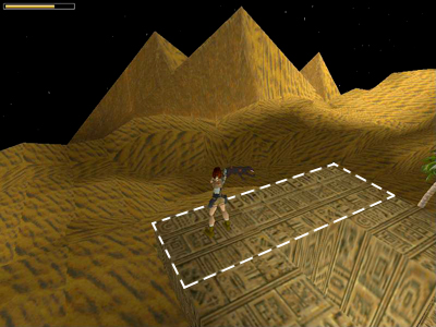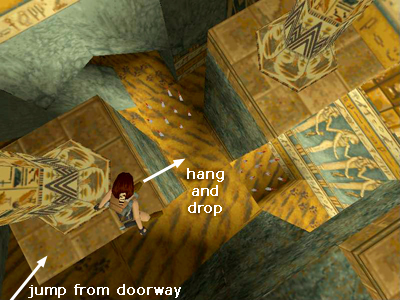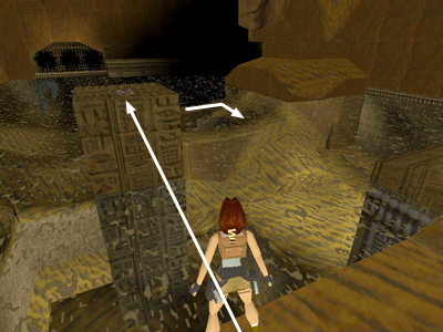 NOTE: If you're playing the PC version of the game and want to get up inside the building with the silver symbol of Hathor, you can download Jeff Reid's patched savegames. The 5th save in the group for level 1 will put Lara there. From that spot you can get to various interesting spots at the top of the room. Instructions for using savegame and .zip files can be found on my help page.
