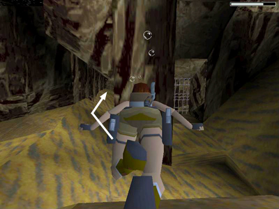 INTO THE DESERT: Advance slowly across the wooden bridge toward the standing mummy. When you're nearly across, it will drop down into a room below. Don't go past the end of the wooden slats, or the level will end prematurely. Instead, turn about 45 degrees to the left, hop back and take a running jump, initially aiming just to the left of the corner block. In mid air, tap the right direction key to pivot Lara in the air and land on a flat spot just beyond the stone structure (as shown in this screenshot). Do not try and land on the stone structure or the level will end. (NOTE: If you have trouble with this method, there are a few alternatives at the end of the walkthrough.)
