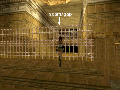 FENCE BUG SHORTCUT: In the FLOODED CAVE WITH SPHINX & OBELISK near the beginning of the level, you can take a shortcut to the SHOTGUN by using the fence bug to run through at one of the seams, like the one shown in this screenshot. However, if you want all the kills, this actually ends up taking longer than the normal route. If you're not familiar with the fence bug, check out my see my useful bugs page at https://tombraiders.net/stella/goodbugs.html for instructions and screenshots.