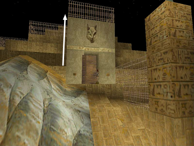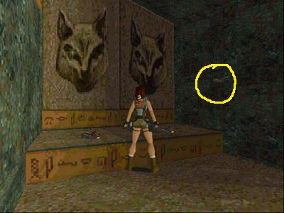 SHORTCUT: You can use the corner bug at the tall, carved pillar in the northeast corner to jump directly to the upper level. From the top you'll get a lovely view of the cat sphinx and avoid a lot of tedious jumping. However, you'll also miss one killthe mummy on the upper level. If you've never used the corner bug or need help, see my useful bugs page at https://tombraiders.net/stella/goodbugs.html. After jumping to the top of the pillar, pick up the walkthrough below at the section "ON TOP OF THE CAT SPHINX."