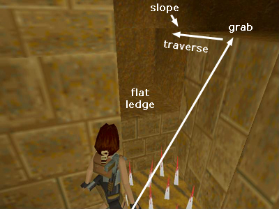 SIDE ROOM WITH SPIKES: Enter and approach the opening in the floor cautiously. There are spikes below. Drop down onto the corner block, then drop down again. Jump over the spikes into the alcove with the shotgun shells (33). Jump back to the previous ledge and then to the alcove with the small medi pack (34). After picking it up, turn around and face out over the spikes. Take a standing jump to grab the horizontal crevice above the spikes and a little to the left (shown in this screenshot). Traverse to the left, pull up and slide down into a short passageway with a switch in a raised alcove. (Alternatively, from the small medi pack alcove, jump back to the flat area in the middle of the room. Then take a running jump to the opening at the top of the short ramp, shown in this screenshot. From there go forward and left to the switch alcove.) Use the switch to open the gold door in the room above. To exit, hop down from the switch alcove and go right. Climb up on the ledge and walk to the edge of the ramp. Take a standing jump down to the flat area in the middle of the room. Then climb out of the pit.